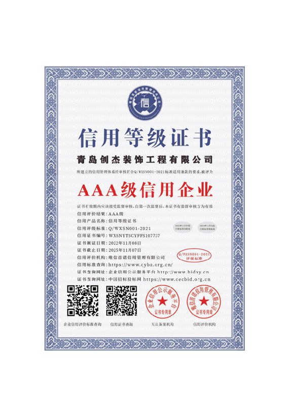 青島創(chuàng)杰裝飾工程有限公司全體同仁,為能有機會向您提供優(yōu)質、全面的服務而感到榮幸。我們將更加不懈的努力,提供更好更優(yōu)質的服務回報客戶。