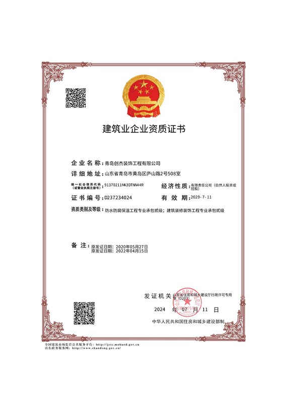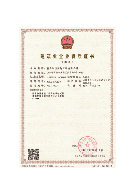 青島創(chuàng)杰裝飾工程有限公司成立于2017年06月09日,注冊資金800萬。公司集裝飾設計、工程施工、水電暖安裝、防水保溫工程、建筑勞務為一體的建筑裝飾企業(yè),主營辦公、酒店、商業(yè)、住宅、學校、醫(yī)院等場所的裝修設計與施工。公司擁有建筑裝修裝飾工程專業(yè)承包貳級、防水防腐保溫工程專業(yè)承包貳級、施工勞務等資質,能夠滿足各種類型和規(guī)模的建筑裝飾工程項目服務需求。