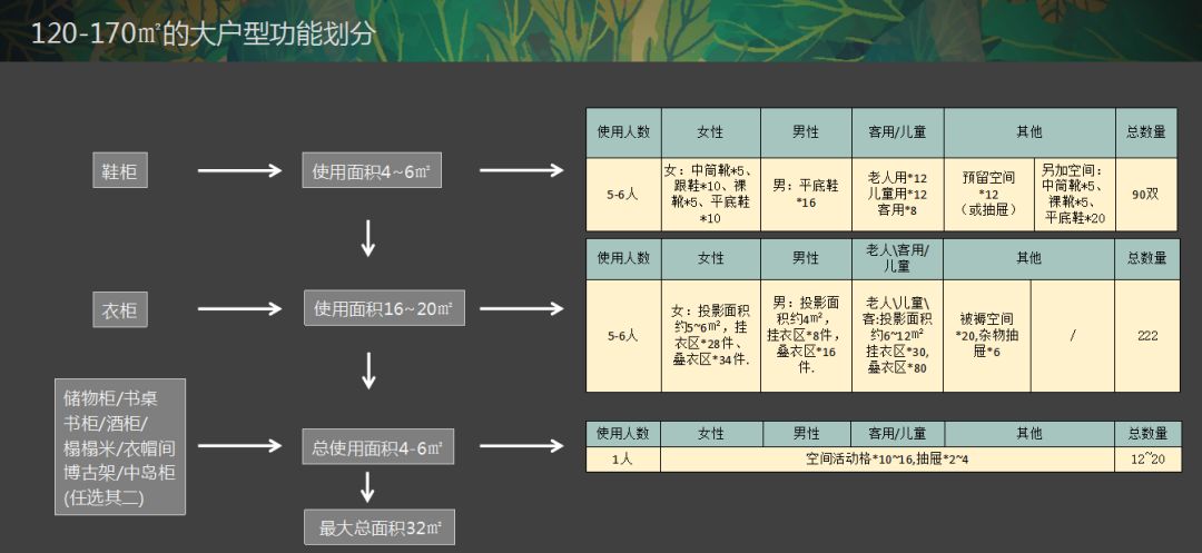這五個部分按照不同的比率來規(guī)劃各自的收納占比,不同的戶型及面積有所不同。